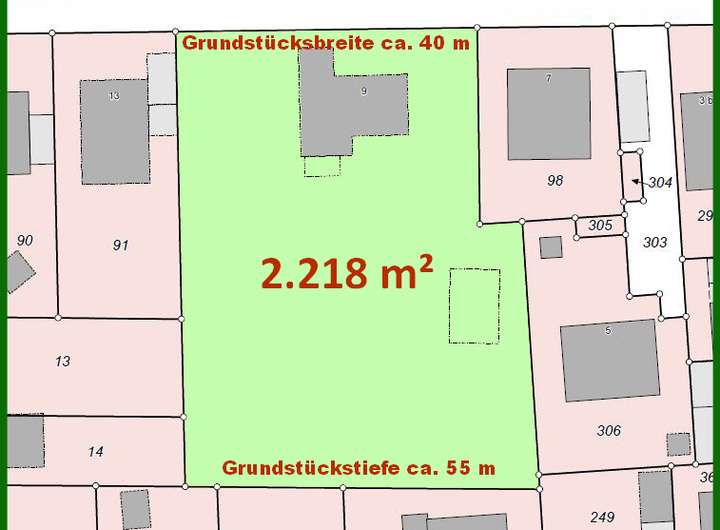 Die Grundstücksbreite beträgt i.M. ca. 40 m und die Grundstückstiefe beträgt ca. 55 m.