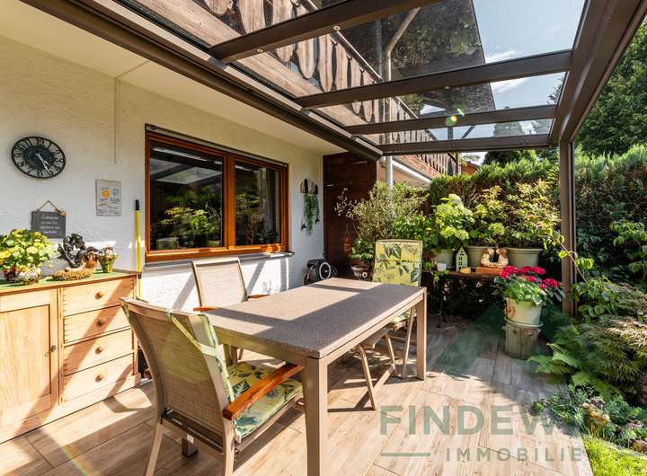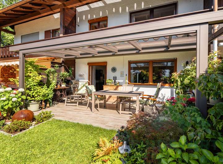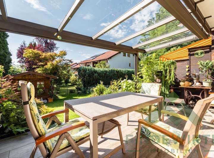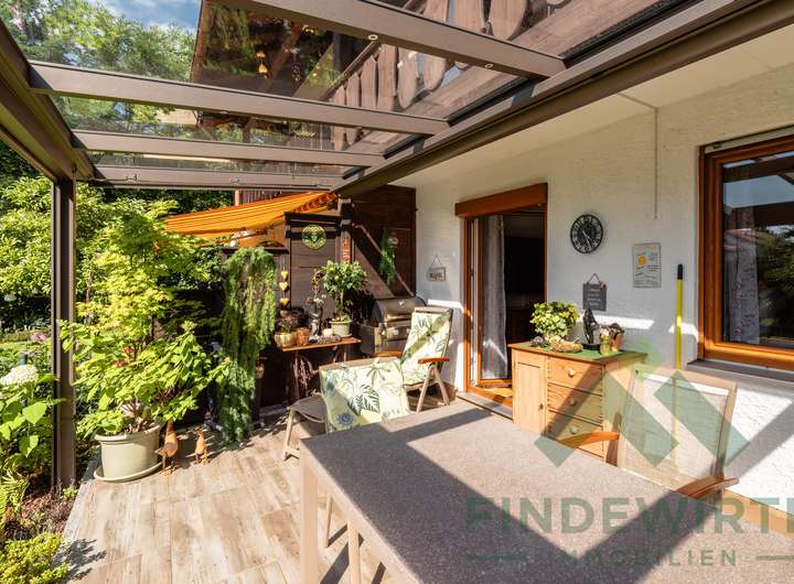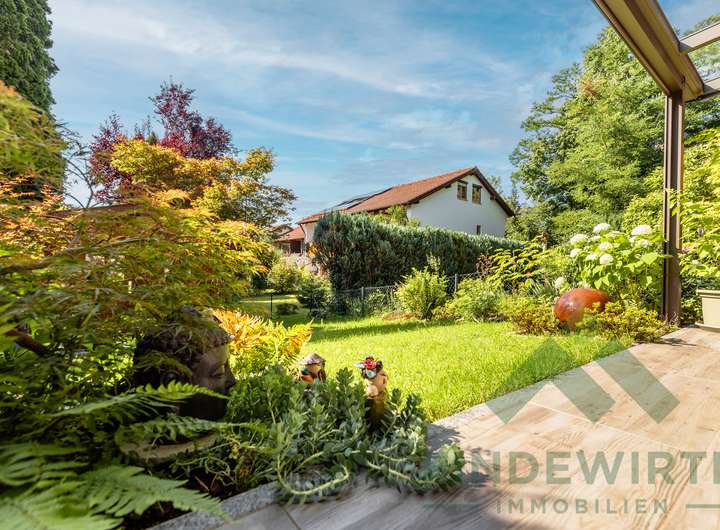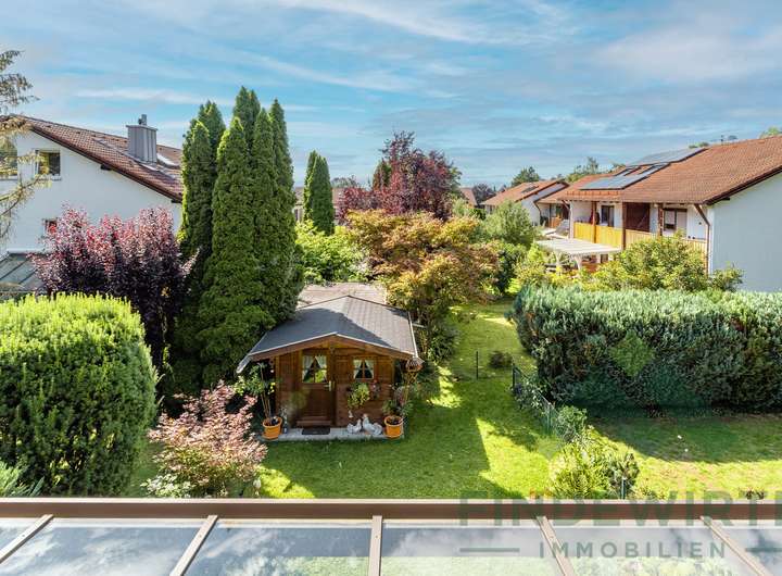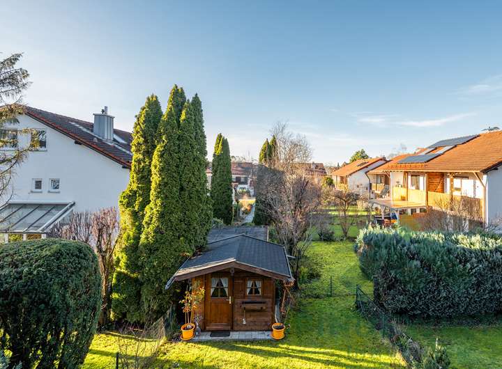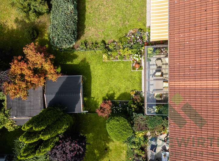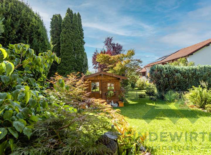 • Garten: Sonnige Südwestterrasse, gepflegte Bepflanzung und eine hochwertige Gartenhütte (Holzparadies Röpfl) auf massivem Fundament. Der Südwestgarten ist leicht abschüssig, überschaubar und besonders pflegeleicht – ideal für alle, die einen schönen Außenbereich möchten, ohne großen Pflegeaufwand.