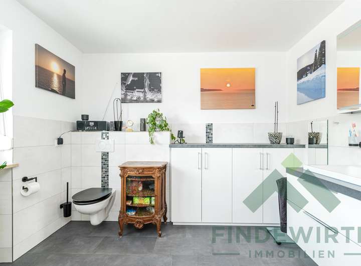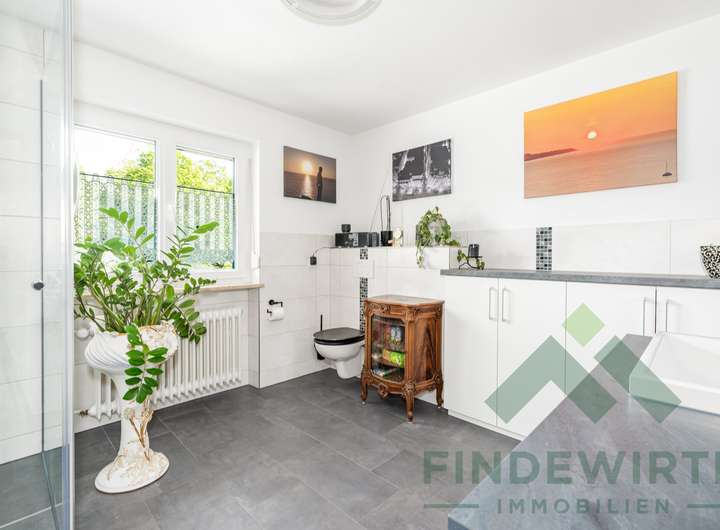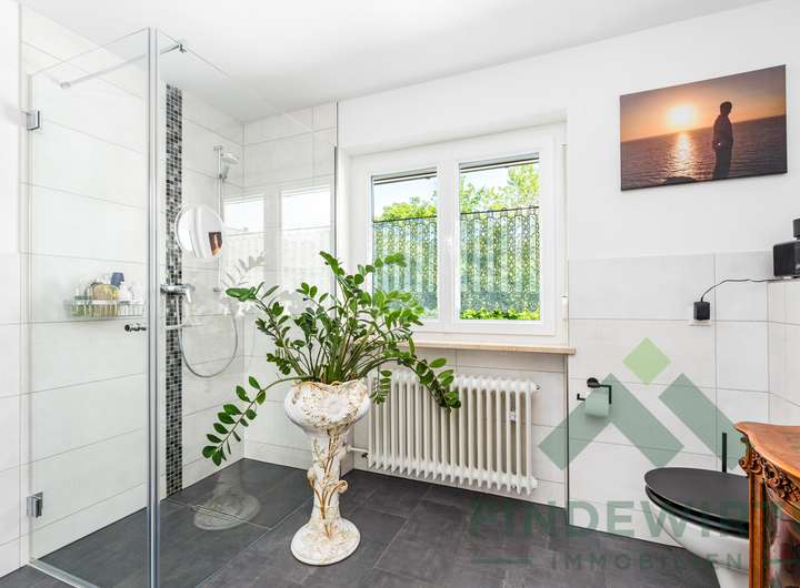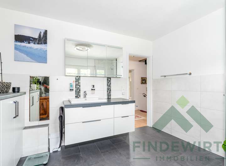 • Badezimmer (1. OG): 2023 komplett neu gestaltet – mit bodengleicher Dusche, maßgefertigtem Waschtisch in Anthrazit sowie Anschlüssen für Badewanne und Doppelwaschbecken. Modern, pflegeleicht und hochwertig.