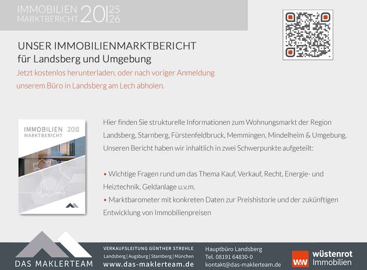 Angebot im qualifizierten Makler-Alleinauftrag. Bei allen Angaben handelt es sich um Angaben des Eigentümers bzw. Dritter. Trotz regelmäßiger Prüfung von Daten, Bildern und Informationen übernehmen wir keine Haftung für die Richtigkeit der Angaben. Ebenso wenig für die Verfügbarkeit des Angebotes bei Vermietung oder Verkauf. Die Informationen in Exposés und auf unseren Webseiten ersetzen keine persönliche Beratung! Wir behalten uns das Recht vor, Änderungen oder Ergänzungen der bereitgestellten Informationen jederzeit vorzunehmen. Copyright © aller Texte und Bilder: Wüstenrot Immobilien Landsberg.