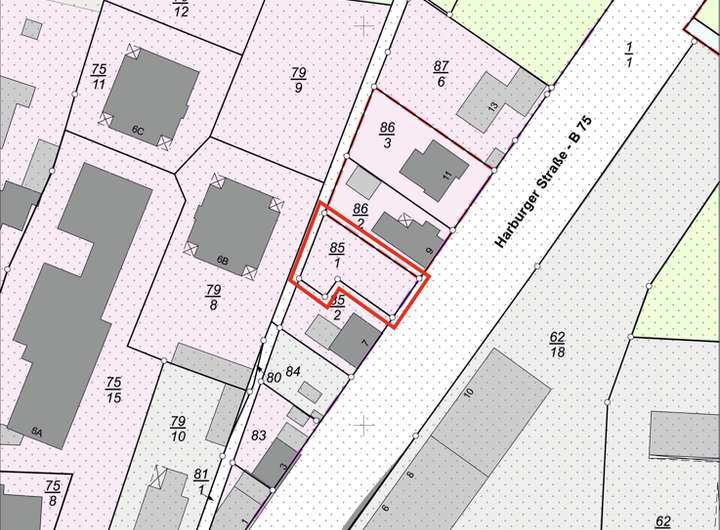 Da das Grundstück keinem Bebauungsplan unterliegt, orientiert sich die Bebauung an der vorhandenen Nachbarbebauung gemäß § 34 BauGB. Es ist sowohl über die Harburger Straße (B75) als auch im unteren Grundstücksbereich über einen Zugang zum sogenannten Gartengeschoss bequem erreichbar.