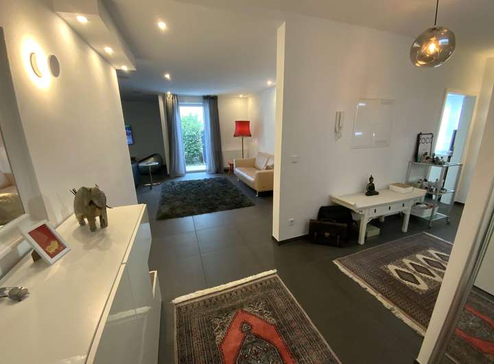 Die Wohnung im Erdgeschoss hat eine Wohnfläche von ca. 116,97 m². Hier befindet sich ein großzügig gestalteter Wohnbereich inkl. hochwertiger Cinema-Elektronik, eine luxuriöse offene Küche mit Essbereich, ein Schlafzimmer, ein Kinder-Arbeitszimmer, ein Gäste-WC, ein Tageslichtbad und eine geräumige Diele.