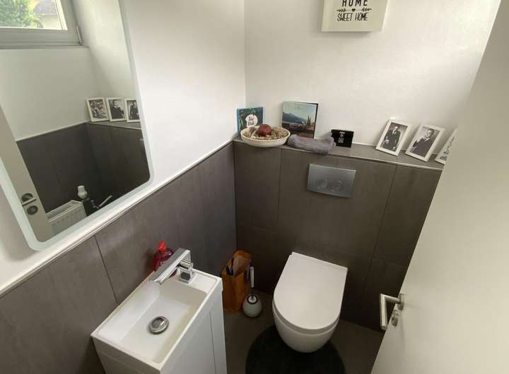 Das Untergeschoss kann als Einliegerwohnung genutzt werden. Mit einem separaten Zugang kann die schöne 2-Zimmer Wohnung von Familie, Mietern oder auch als Büro genutzt werden. Wir haben hier eine Wohnfläche von ca. 64,08m², aufgeteilt in ein Schlafzimmer mit angrenzendem Dusch-Bad, ein Wohn- Essbereich mit integrierter Küche, eine Diele sowie ein Gäste-WC.