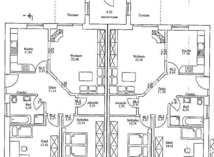 Insgesamt stehen Ihnen ca. 168 m² Wohnfläche zur Verfügung – aufgeteilt in zwei Einheiten à ca. 84 m². Jede Hälfte bietet drei gut geschnittene Zimmer, die sich ideal als Wohn-/Essbereich, Schlafzimmer und Arbeits- oder Gästezimmer nutzen lassen. Große Fensterflächen sorgen für viel Tageslicht, während die offene Raumgestaltung und die moderne Ausstattung für hohen Wohnkomfort sorgen.