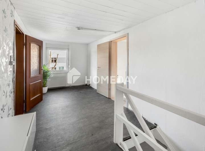 Im Erdgeschoss gelangen Sie über den einladenden Flur in die gemütliche Küche sowie in das moderne Badezimmer mit Dusche und Waschmaschinenanschluss. Über einen zweiten Flur erreichen Sie das komfortable Schlafzimmer. Das großzügige Esszimmer mit direkter Verbindung zum Wohnzimmer schafft eine offene und freundliche Wohnatmosphäre. Das Obergeschoss überzeugt mit einem geräumigen, flexibel nutzbaren Zimmer, das sich ideal als Schlaf-, Arbeits- oder Hobbyraum anbietet. Ein weiteres Zimmer sowie ein praktischer Abstellraum bieten zusätzlichen Platz und Gestaltungsmöglichkeiten.