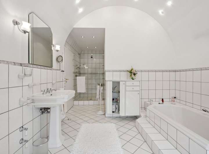 Ein Duschbad mit WC ist direkt neben dem Gästezimmer, ein Hauswirtschaftsraum mit Anschluss für Waschmaschine und Trockner sowie ein Abstellraum mit direktem Zugang zum Heizungsraum.