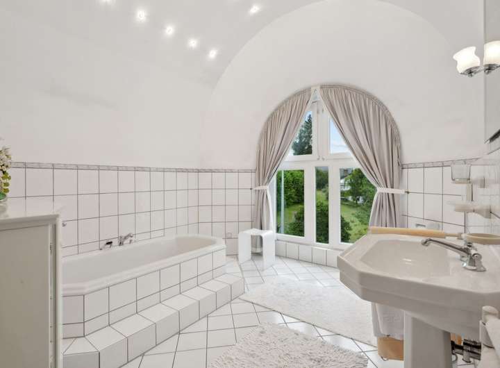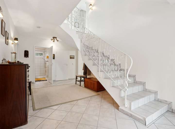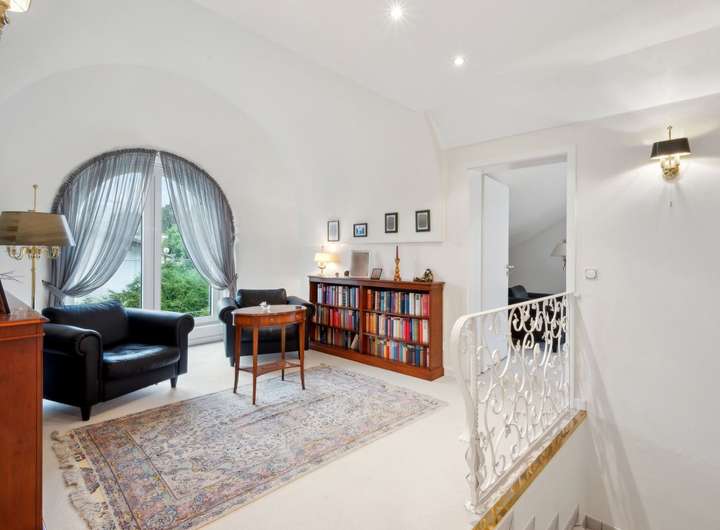 Über eine zentrale Treppe gelangt man in das Obergeschoss. Hier befindet sich ein großer Flur mit Rundfenstern, der die Räume gut miteinander verbindet.