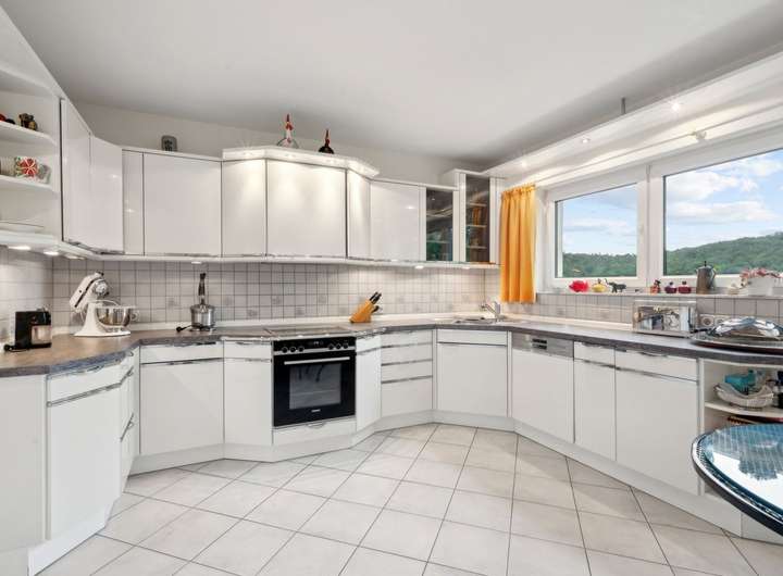 Linker Hand befindet sich eine voll ausgestattete Küche mit viel Platz und Stauraum sowie ein Esszimmer mit Zugang zum Balkon.