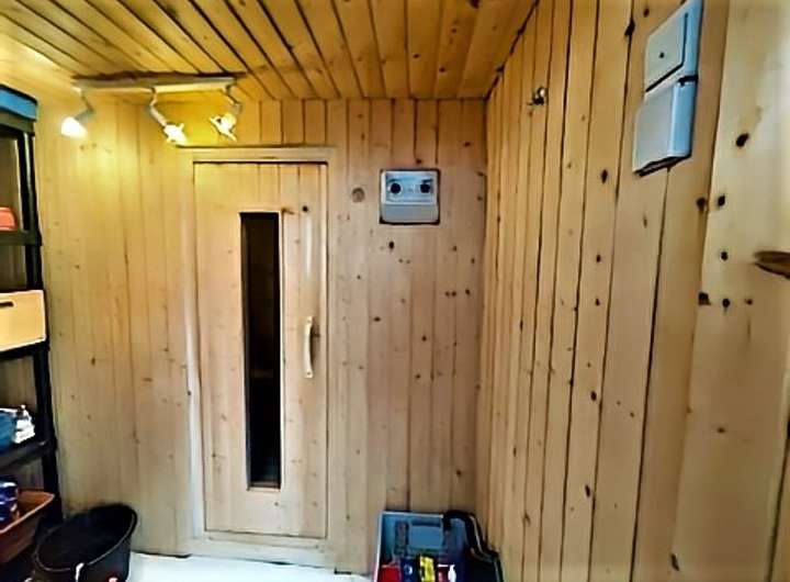 Angrenzend an die Pergola liegt ein massiv erbautes Zusatzgebäude, welches in eine Sauna und eine Werkstatt unterteilt ist.