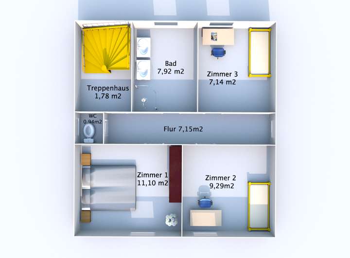Zu Ihrer Rechten verfügen Sie im 1. Stock über ein geräumiges Schlafzimmer sowie ein weiteres, frei verplanbares Zimmer für Kind, Hobby, Beruf etc.