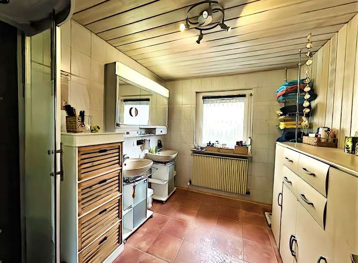 Im Kellergeschoss wiederum verfügen Sie über ein zweites Badezimmer - zur Einliegerwohnung gehörend - mit Badewanne, Dusche, Waschbecken und WC. Der fast 15 Quadratmeter große Wohnraum im Keller ist mit Lichteinfall von 2 Seiten angenehm hell und einladend, so daß Sie im Keller über eine kleine Einliegerwohnung verfügen. Diese ist perfekt für Teenager, die ältere Generation oder zur komfortablen Unterbringung von Gästen geeignet.
