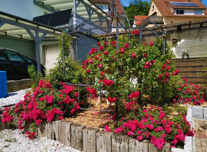 Neben freier Grünfläche (z.B. für Spielgeräte) bietet das Objekt eine in Rosen gebettete Pergola und viel Platz, um Gemüse- oder Blumenbeete anzulegen.