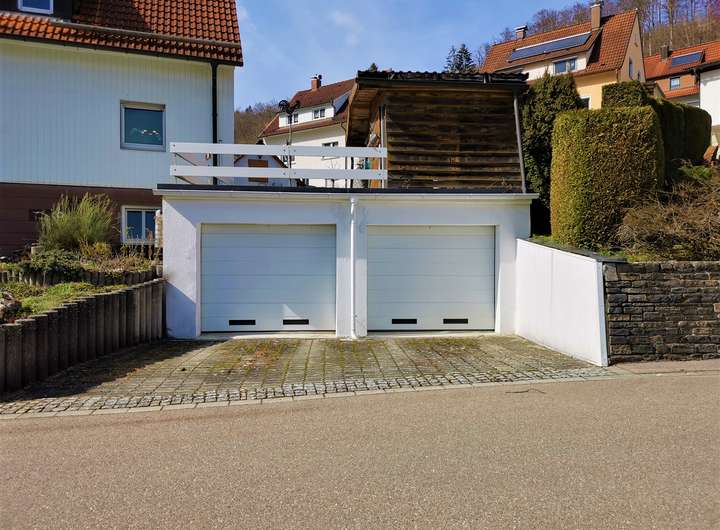 Zwei Garagen sowie 2-3 weitere Stellplätze runden den Außenbereich ab. Das Garagendach ist als große Terrasse gestaltet. Der an die Terrasse angrenzende Schuppen bietet zusätzlichen Stauraum.
