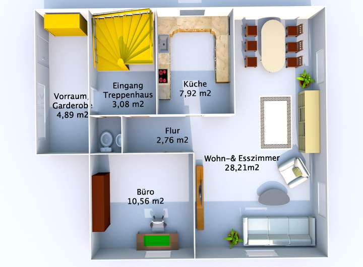 Abgerundet wird das EG durch einen aktuell als Büro genutzten Raum sowie ein Gäste-WC.