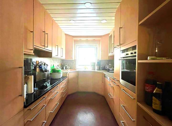 Daneben befindet sich die Küche mit einer gepflegten, U-förmigen Küchenzeile. Hier treffen viel Stauraum und ausreichend Freifläche für Ihre Küchengeräte aufeinander, so daß auch Hobbyköche auf Ihre Kosten kommen.