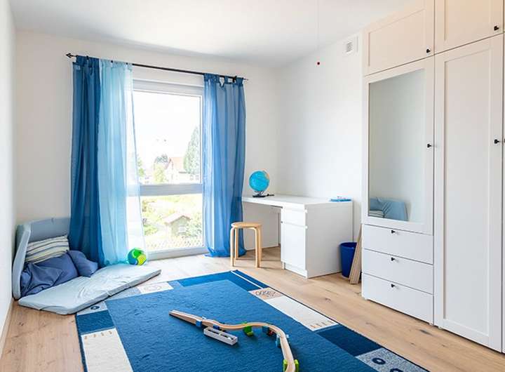 Das Obergeschoss besteht aus zwei nahezu gleich großen Kinderzimmern, einem großzügigen Familienbad und dem Elternschlafbereich mit Ankleide und direktem Zugang zum Bad. Die Nettoraumfläche beträgt 144,36 m².