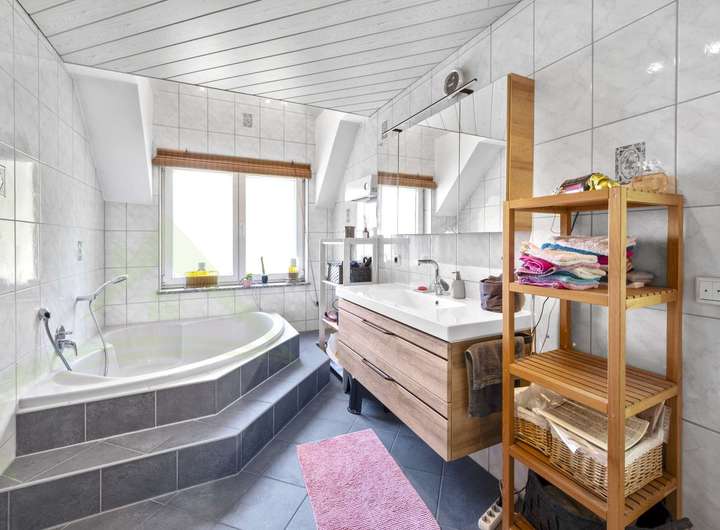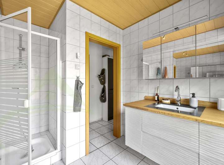 Im Obergeschoss erwarten Sie drei lichtdurchflutete Schlafzimmer sowie ein luxuriöses Tageslichtbad mit großzügiger Eckbadewanne, separater Dusche, Doppelwaschtisch und stilvollen Holz- und Fliesenakzenten. Hier vereinen sich Funktionalität und Design auf hohem Niveau.