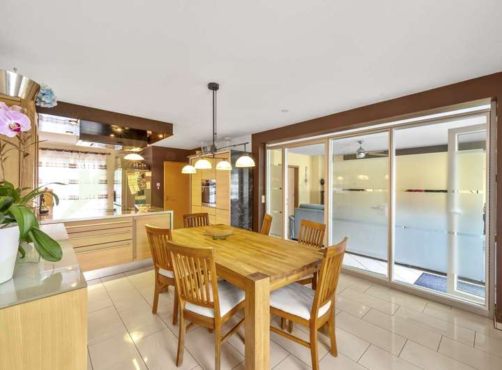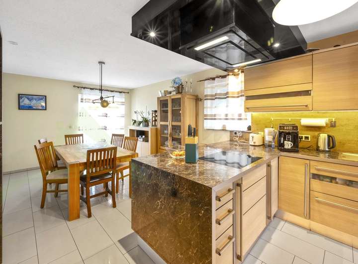 Bereits der Eingangsbereich empfängt Sie mit einem offenen, hellen Ambiente und einer gut erhaltenen Treppe, die alle Erdgeschoss und Obergeschoss miteinander verbinden, das Dachgeschoss erreichen Sie über eine elegante Wendeltreppe. Im Erdgeschoss befindet sich das Herzstück des Hauses: ein großzügiges Wohnzimmer mit gemütlichem Kaminofen für kalte Winterabende sowie Zugang zur Terrasse und zum gepflegten Garten. Der angrenzende Essbereich ist offen gestaltet und geht direkt in die moderne Einbauküche über. Diese ist mit hochwertigen Geräten, viel Stauraum, einer stilvollen Granitarbeitsfläche und Kochinsel ausgestattet – ein Paradies für Hobbyköche. Ein Badezimmer sowie ein Hauswirtschaftsraum runden das Raumangebot auf dieser Ebene ab.
