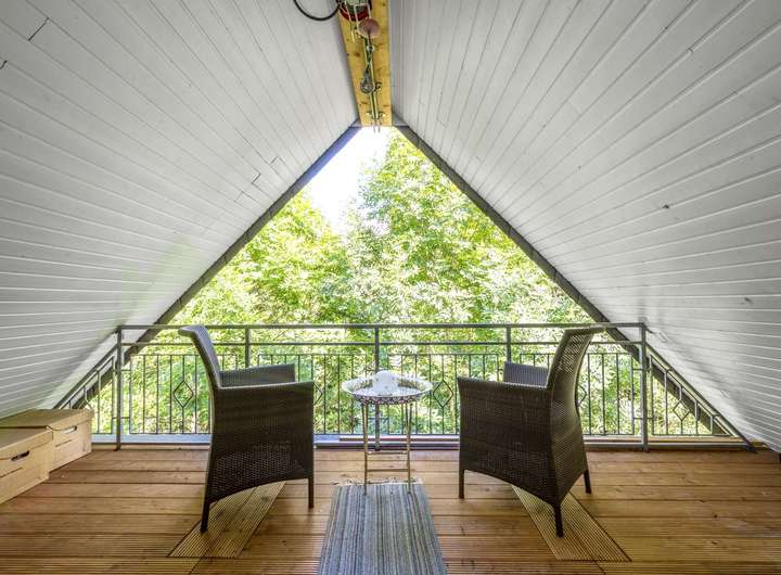 Das ausgebaute Dachgeschoss bietet zwei weitere, großzügige Räume, die sich flexibel als Büro, Gästezimmer oder Hobbybereich nutzen lassen. Der große Balkon mit Blick ins Grüne erweitert diesen Rückzugsort ideal und schafft zusätzliche Aufenthaltsqualität.
