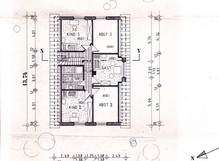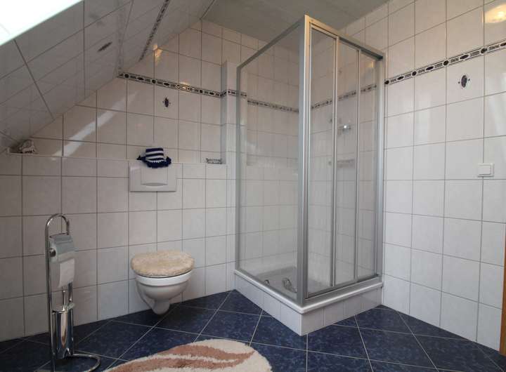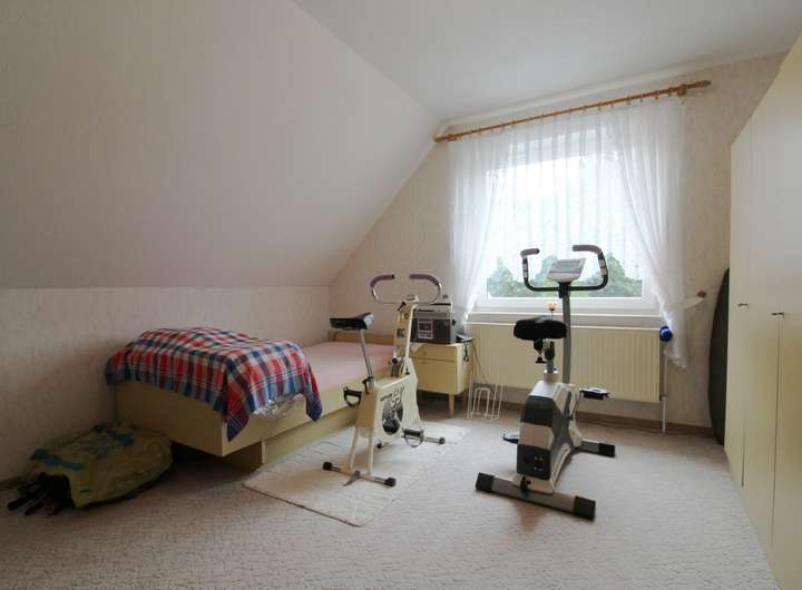 In das Obergeschoss gelangt man über eine elegante Holztreppe in der bereits erwähnten Eingangsdiele. Hier stehen dem zukünftigen Eigentümer fünf weitere, unterschiedlich große Zimmer zur Verfügung. Da die Erbauer seinerzeit die Räumlichkeiten oben nicht alle benötigten, wurden zwei der fünf Räume noch nicht ganz fertig gestellt. In diesen Räumen müssen allerdings nur noch die Heizkörper angeschlossen und Malerarbeiten durchgeführt werden. Ein weiteres Badezimmer, ausgestattet mit einer Dusche, ist ebenfalls vorhanden.