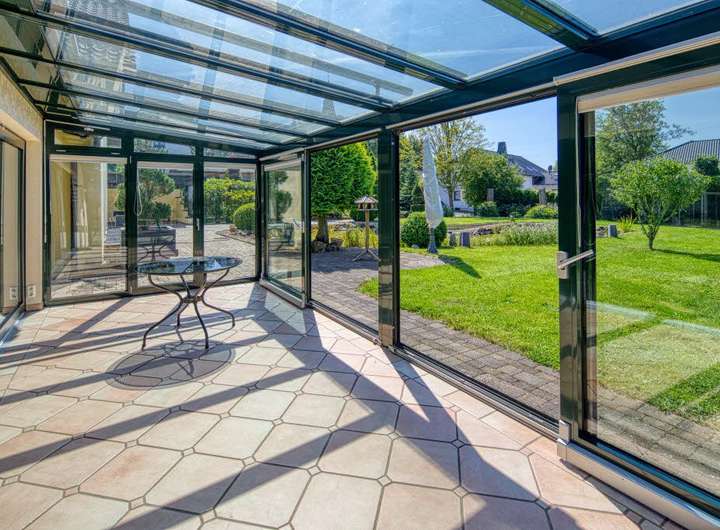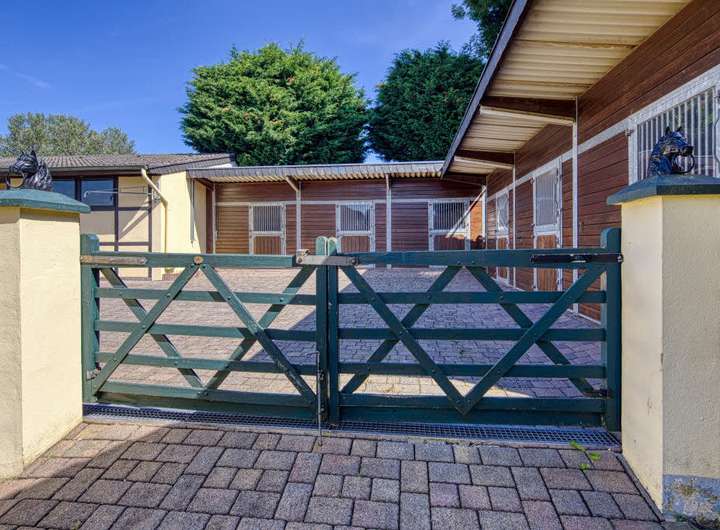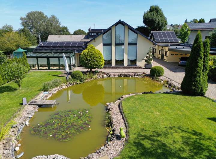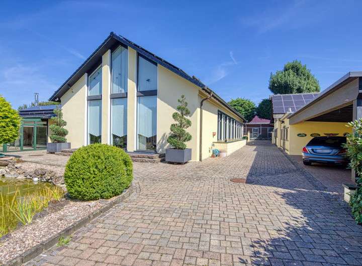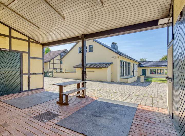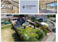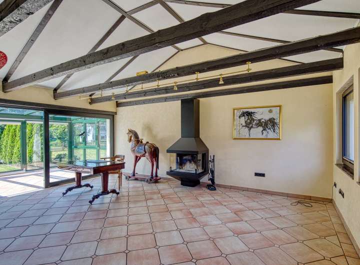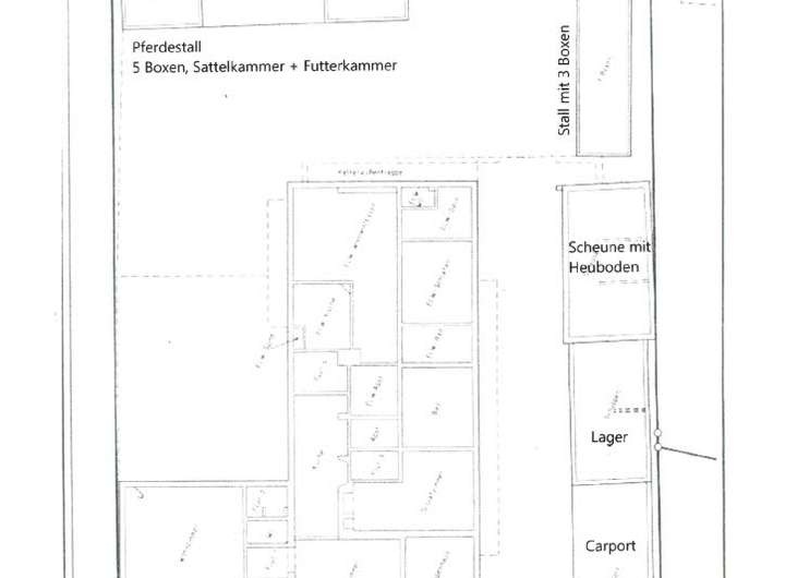 Repräsentatives Anwesen zum Wohnen, Pferdehaltung und Arbeiten. Wohnfläche gesamt 400 m²: Hauptwohnung ca. 300 m² Wfl., 6 Zimmer, 2 Küchen, 3 Bäder, Wintergarten, 2 Kaminöfen, zuzüglich ca. 104 m² wohnlich ausgebautes UG; Einliegerwohnung ca. 96 m², 2 Zimmer, Küche, Bad, Gäste-WC; 11 Pferdeboxen in separaten Stallgebäuden, weiteres Scheunengebäude mit Solarium/Waschplatz für Pferde, Carport (Platz für 3