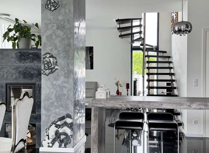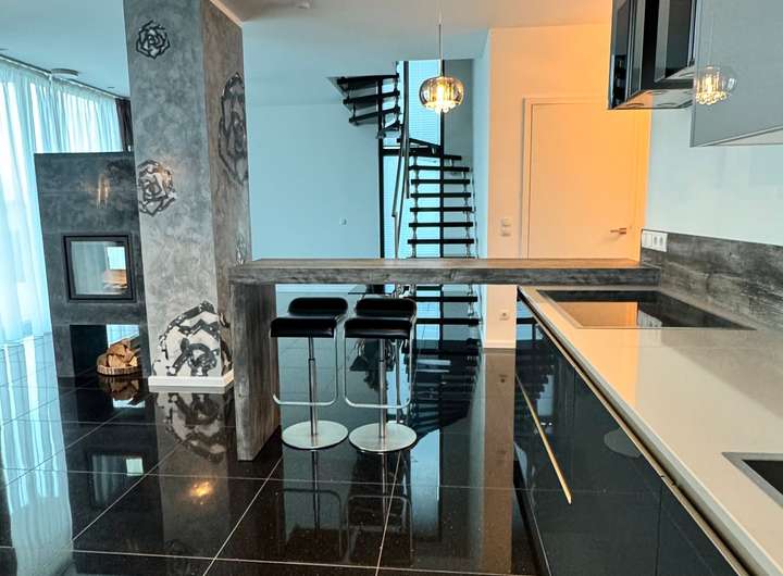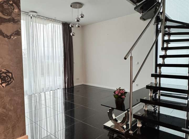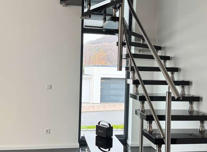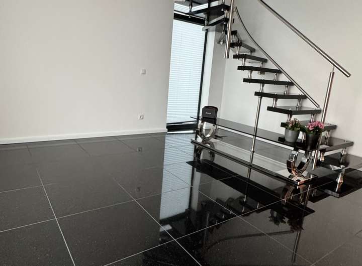 Über eine elegante Granittreppe mit Edelstahlgeländer gelangen Sie ins Obergeschoss mit drei stilvollen Zimmern: