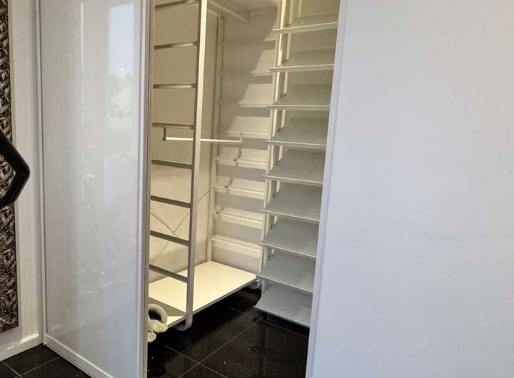 • Maßgefertigte Regalsysteme in Garderobe, Abstellraum und begehbarem Kleiderschrank