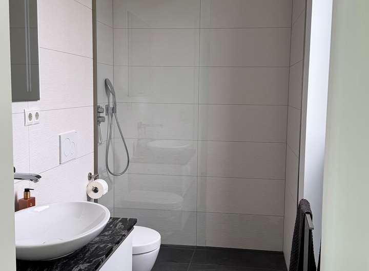 • Gäste-Bad mit bodengleicher Dusche, Waschtisch und Spiegelschrank