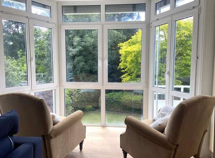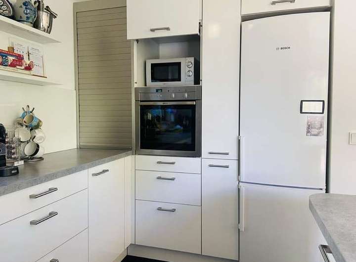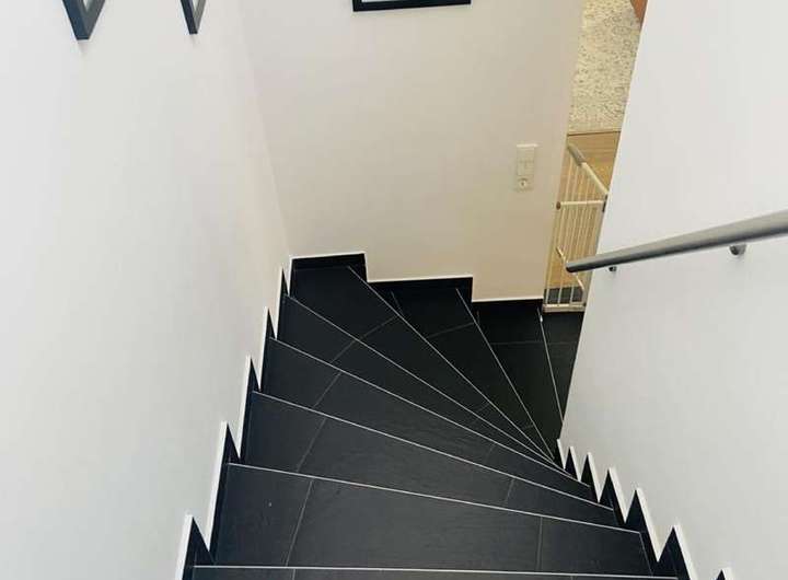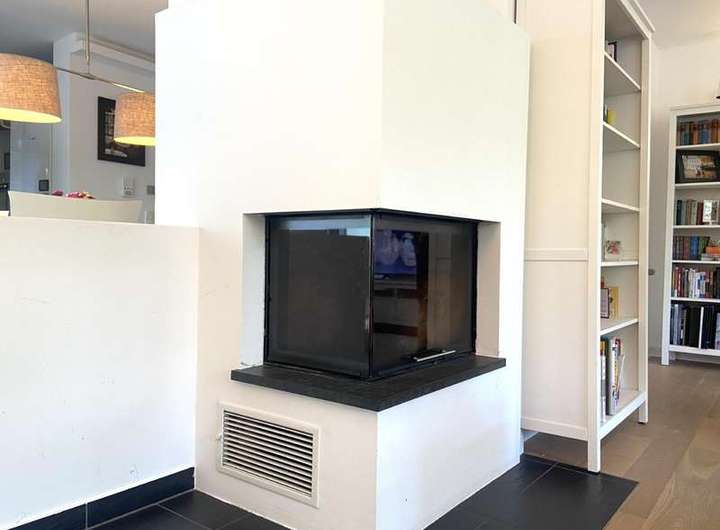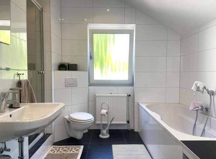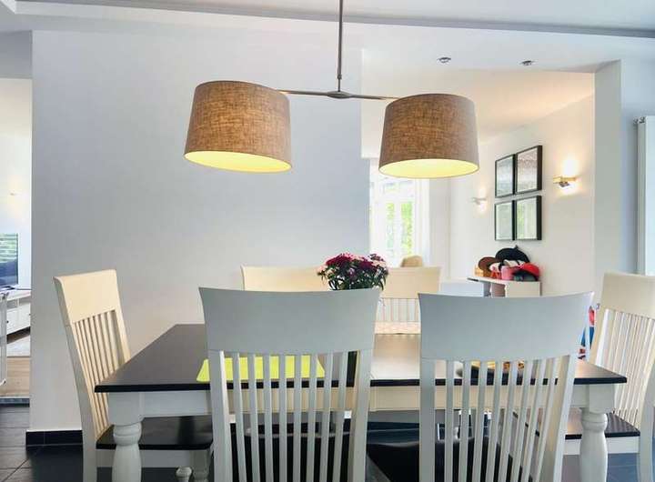 Bei der Modernisierung in 2015 wurden die großen Fenster mit Rollläden oder Jalousien teilweise ausgetauscht und eine neue weiße Einbauküche mit Lackfronten eingebaut. Die Böden im Eingangs- und Küchenbereich sowie in den Bädern sind mit eleganten Schieferplatten belegt und geben dem Erdgeschoss einen angenehm modernen Look. Hierzu tragen auch die glatt verputzten Wände und eingebaute Deckenspots bei. Ein großer Kamin im Wohnbereich sorgt für stimmungsvolle Wärme. Im Wohn-und Gästebereich wurden massive Eichendielen und in den Schlafzimmern Teppichboden verlegt. Bäder und Gäste-WC