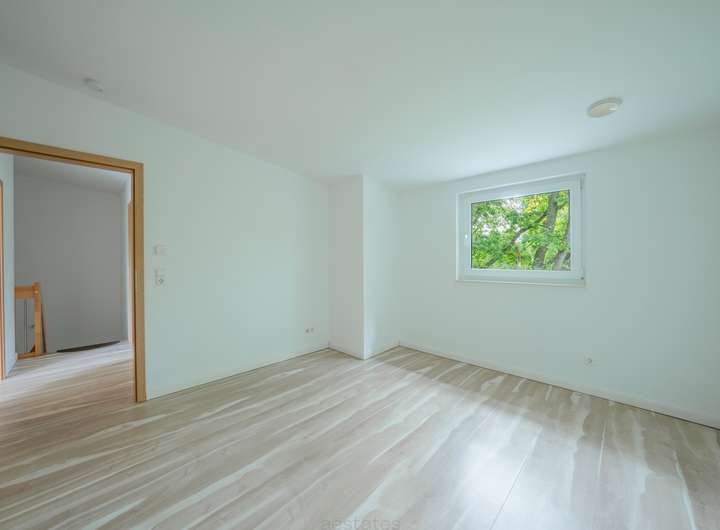 Vom Wohnbereich aus gelangen Sie direkt in den sonnigen Garten – perfekt zum Spielen, Gärtnern oder einfach zum Entspannen. Ein Gäste-WC sowie ein kleiner Abstellraum runden das Raumangebot im Erdgeschoss ab. Im ersten Obergeschoss geht es weiter mit zwei Schlafzimmern und einem Vollbad. Eines der beiden Schlafzimmer überzeugt durch seine Größe und den begehbaren Kleiderschrank. Ganz oben im Dachgeschoss wird es noch einmal besonders: Hier erwarten Sie zwei weitere Schlafzimmer, eines davon mit Zugang zu der Dachterrasse in Südausrichtung. Zudem gibt es auf dieser Etage ein weiteres Bad und einen Technik- und Abstellraum mit Wärmepumpe und Waschmaschinenanschluss.
