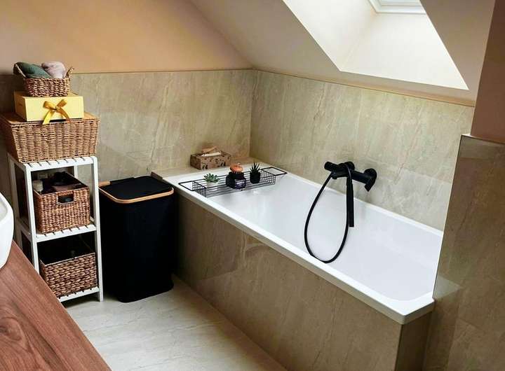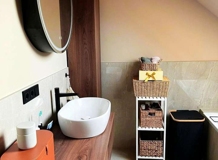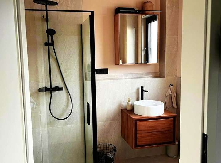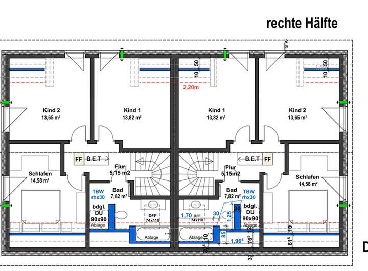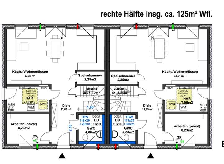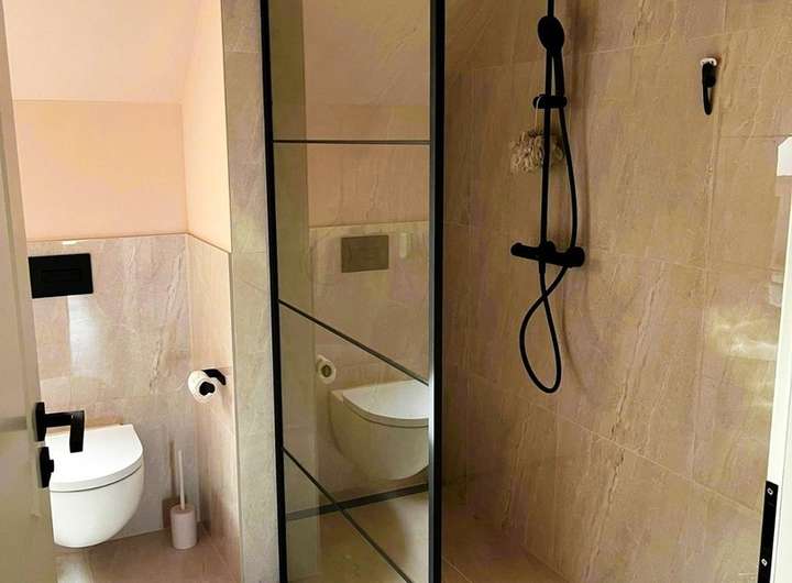 Im Erdgeschoss befindet sich ein großzügiger Wohn- und Essbereich mit offener Küche, eine Speisekammer, ein Arbeitszimmer sowie ein Gäste-WC mit Dusche. Das Obergeschoss bietet zwei Kinderzimmer, ein Schlafzimmer mit angrenzender Ankleide sowie ein hochwertig ausgestattetes Badezimmer mit Dusche. In beiden Geschossen ist jeweils eine Dusche vorhanden.
