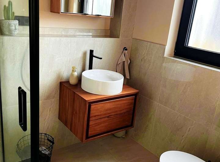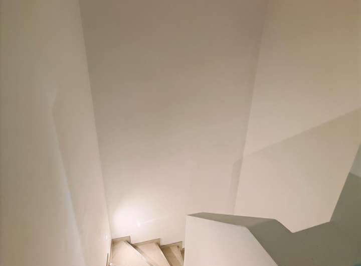 Die Bodenbeläge sind modern und langlebig: Im Flur, in der Haustechnik sowie in den Bädern werden 60 x 60 cm große Feinsteinzeugfliesen verlegt, in Bad und Gäste-WC auch an den Wänden bis 1,20 m Höhe, im Duschbereich deckenhoch. Die Bodenfliesen werden zusätzlich in Bad und Gäste-WC verlegt. In den übrigen Räumen sorgt ein hochwertiger Vinylboden für ein angenehmes Ambiente. Die massive Stahlbetontreppe wird mit Naturstein passend zu den Fliesen ausgestattet. Eine Fußbodenheizung in allen Räumen sorgt für wohlige Wärme.