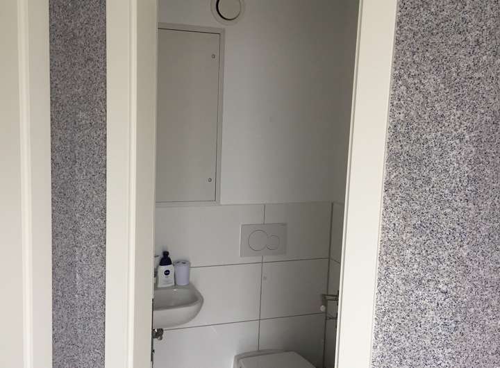 - Gäste-WC: Fliesen, Waschbecken, WC.