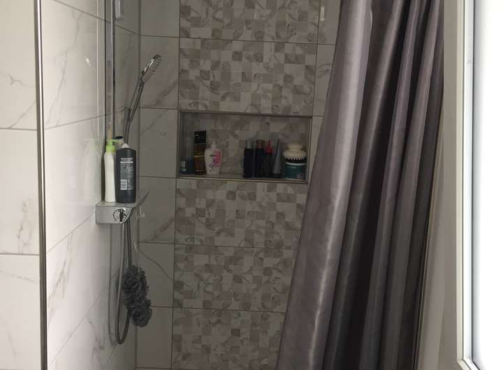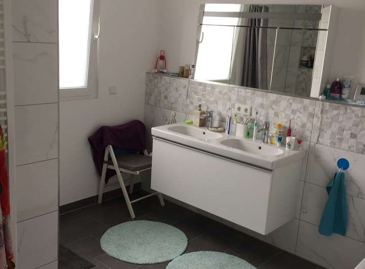 - Badezimmer 1. OG: hochwertige Fliesen, Doppelwaschbecken, Dusche und Badewanne, WC, Platz für Waschmaschine und Trockner.