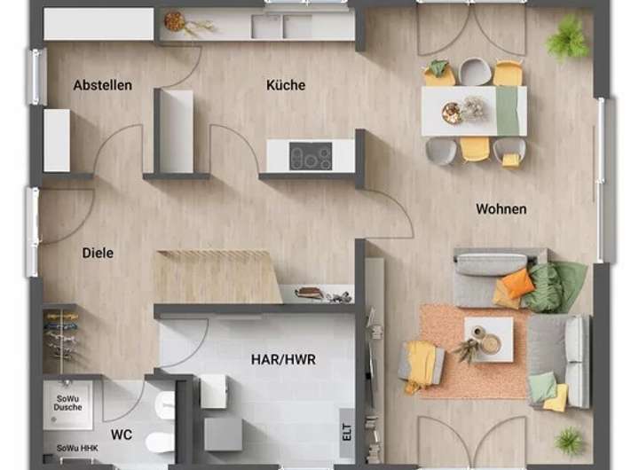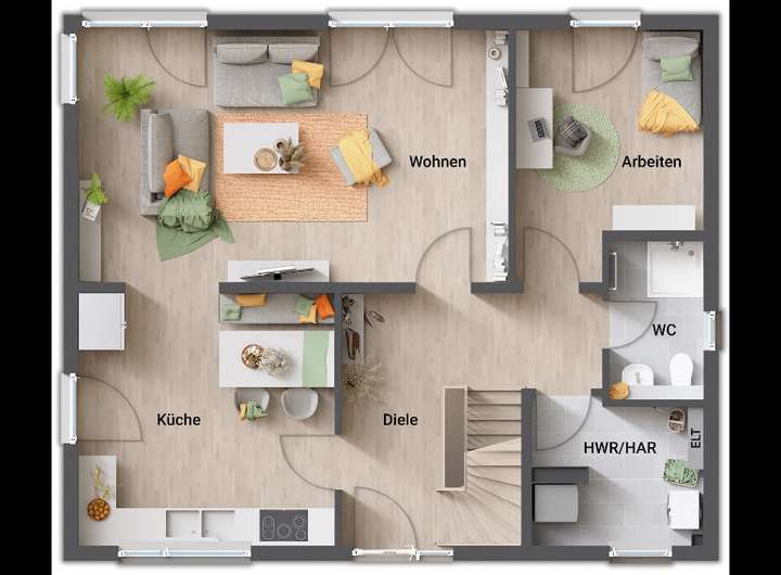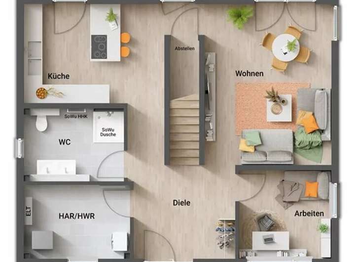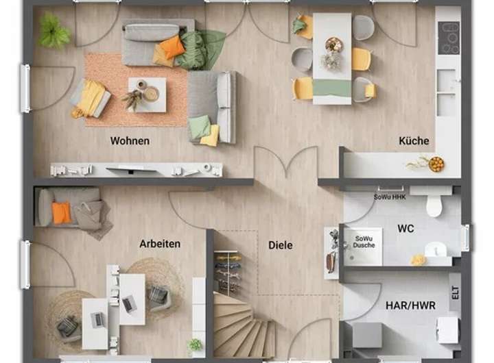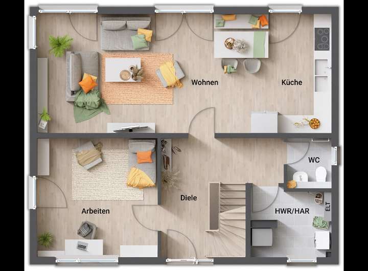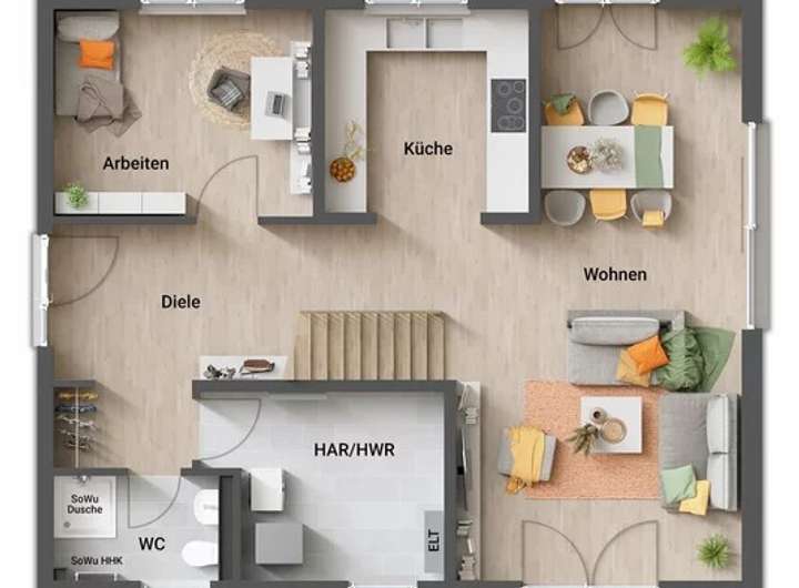 In der Küche haben Sie genug Platz für gemeinsame Kochabende mit den Liebsten oder ein schnelles Frühstück unter der Woche. Wer hin und wieder lieber im Home-Office arbeitet, kann sich neben dem Wohnzimmer ein Arbeitszimmer einrichten.