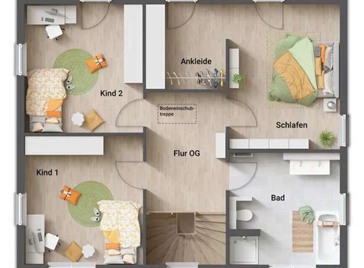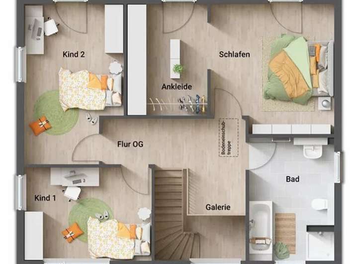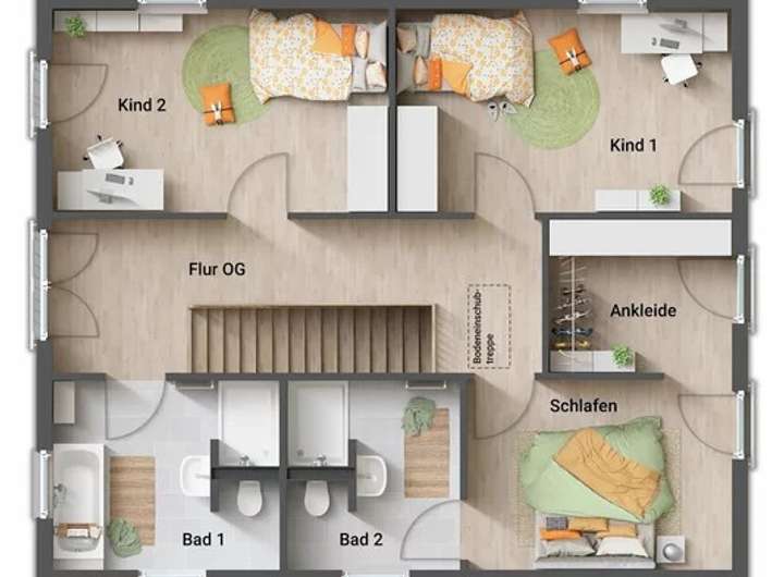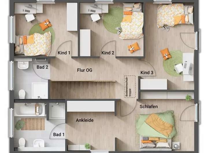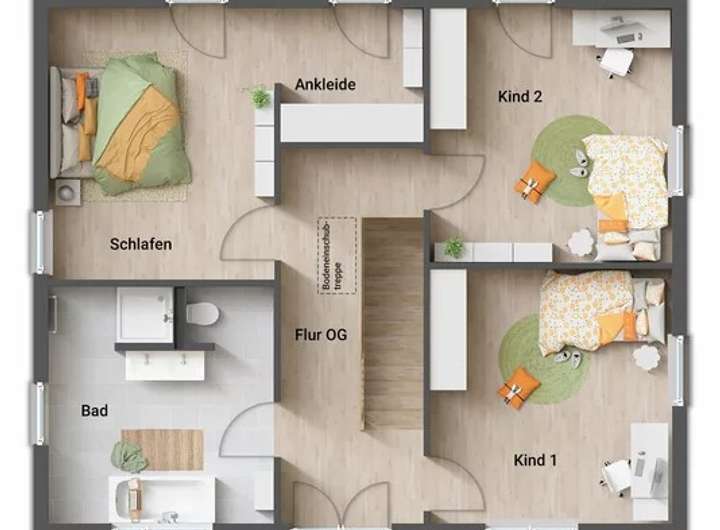 Auch das Obergeschoss zeigt sich im gradlinigen Baustil des Hauses. Hier finden Sie drei Zimmer, die Sie nach Ihren Vorstellungen als Schlaf-, Kinder- oder Gästezimmer nutzen können. Große Fenster lassen auch hier viel Tageslicht hineinströmen. Die Ankleide im Schlafzimmer bietet viel Stauraum.