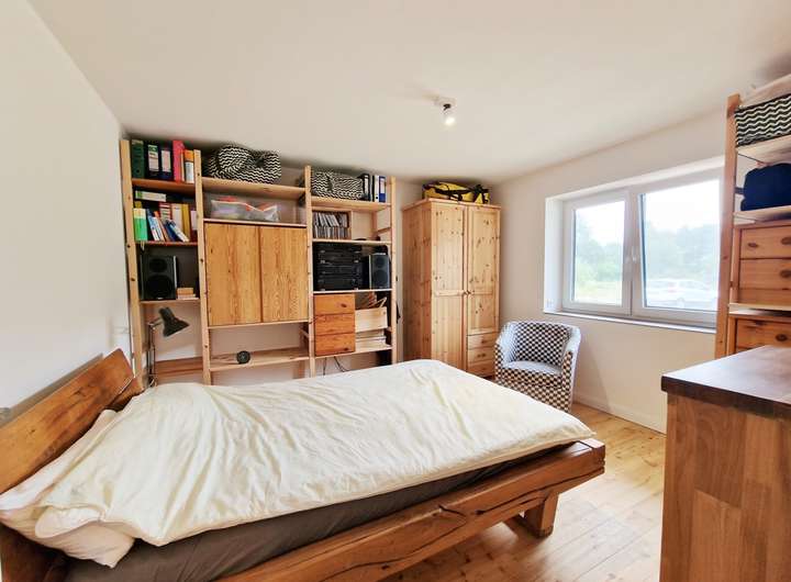 Der private Rückzugsbereich umfasst ein Schlafzimmer sowie ein Kinder-/Arbeitszimmer. Ein modernes Duschbad und ein separates Gäste-WC runden das Raumangebot ab. Zusätzlich stehen ein Hauswirtschaftsraum im Erdgeschoss sowie praktischer Stauraum auf dem Dachboden zur Verfügung. Hochwertige Materialien unterstreichen den gepflegten Eindruck: Im Erdgeschoss wurden edle belgische Blausteinfliesen verlegt; im Schlafzimmer sorgt Echtholzparkett für warme Wohnatmosphäre. Fein verputzte Wände schaffen ein ruhiges, zeitloses Ambiente.