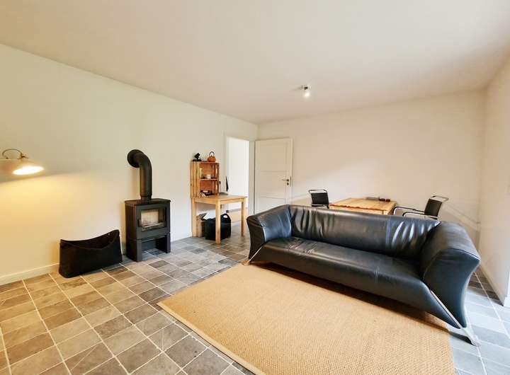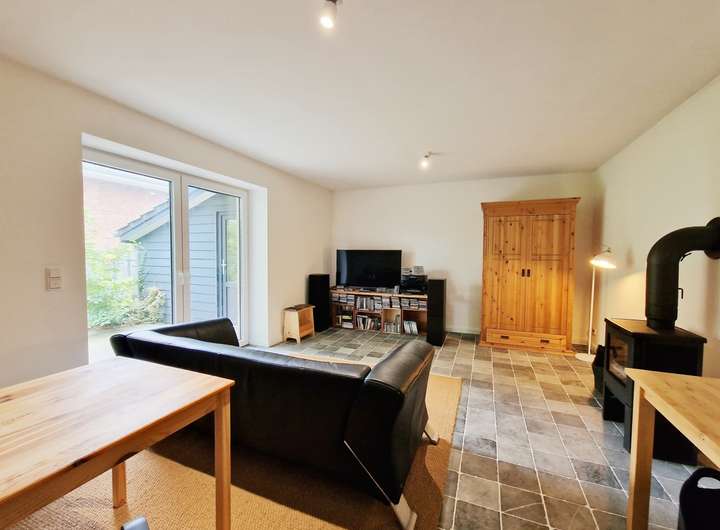 Heller Wohnbereich mit Kaminofen & Zugang zur Terrasse