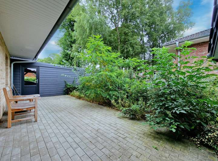 Terrasse mit kleinem Abstellraum; angelegter Garten mit Blick ins Grüne