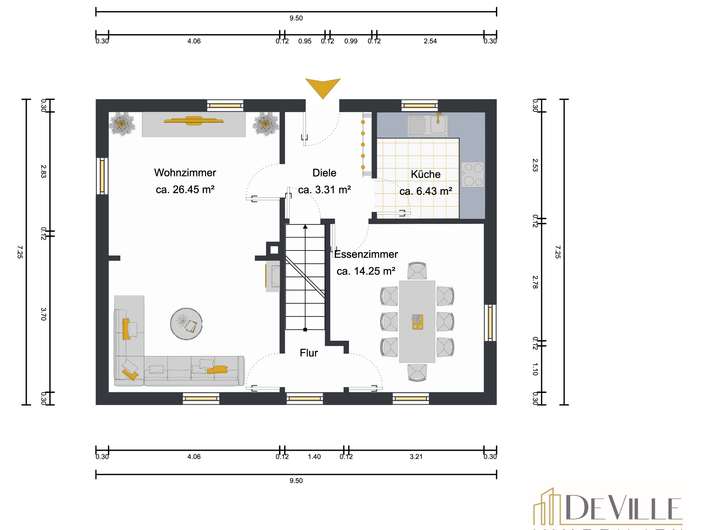 Im Erdgeschoß betreten Sie den Eingangsbereich, von wo aus Sie die Küche das Wohn- sowie das Esszimmer erreichen. Alle Räume hier sind hell und großzügig.