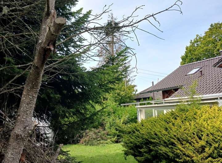 Der eingewachsene Garten mit altem Baumbestand und sonnigen Freiflächen schafft eine angenehme Privatsphäre.
