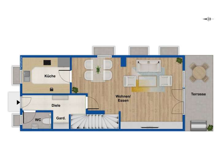 Das gesamte Grundstück umfasst ca. 415 m² und bietet mit einer großzügigen Terrasse sowie einem Garten viel Raum für Erholung und Freizeitgestaltung. Der offene Wohn- und Essbereich bildet das Herzstück des Hauses und schafft mit seiner hellen und freundlichen Atmosphäre ein angenehmes Wohngefühl. Eine moderne Einbauküche ist bereits vorhanden. Ein Gäste-WC im Erdgeschoss ergänzt den praktischen Grundriss.