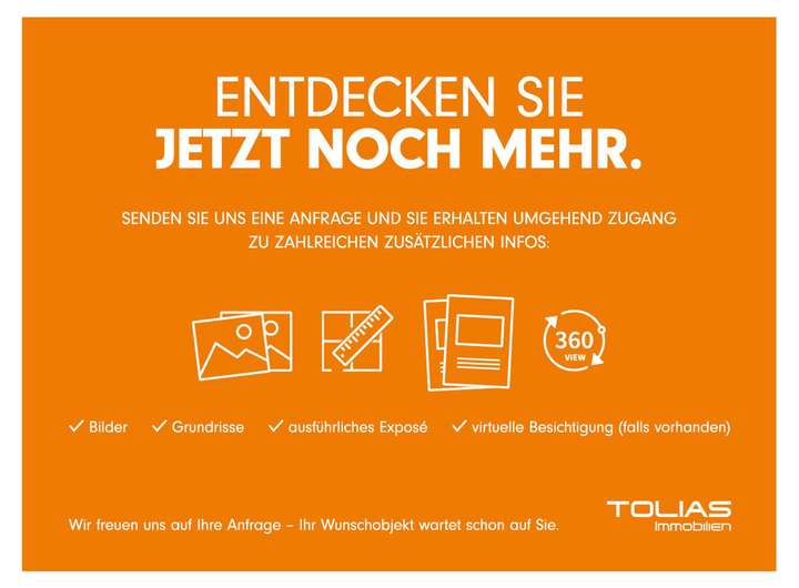 1. Senden Sie uns eine Anfrage und erhalten Sie ein ausführliches Exposé mit weiteren Bildern, Grundrissen, der Objektadresse, detaillierten Objektinformationen und sofern vorhanden eine virtuelle Besichtigung.