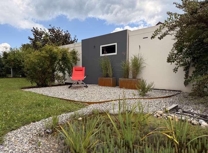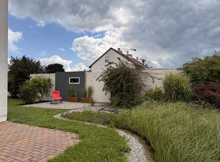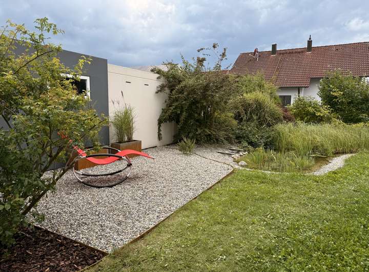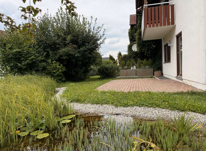 Der schön angelegte Garten auf der Südseite, mit Teich und Freisitz, bietet eine private Rückzugsfläche im Freien in dem sich Gartenliebhaber verwirklichen können.