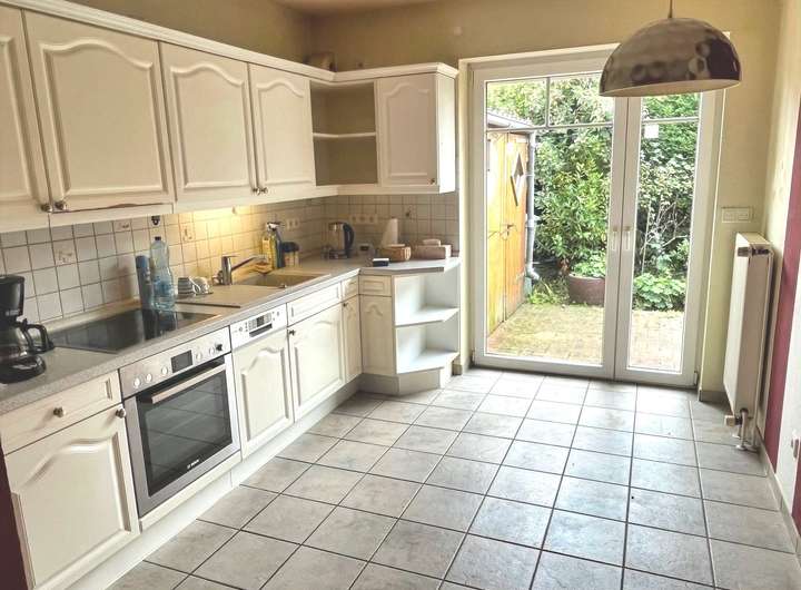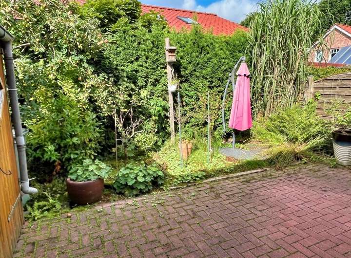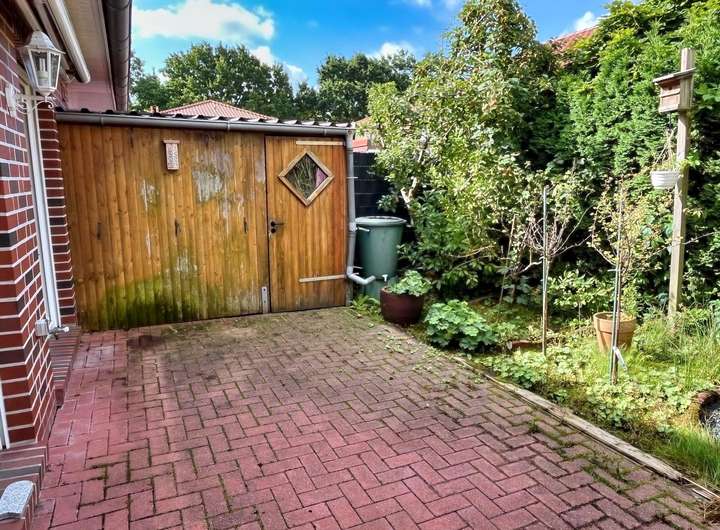 In dem pflegeleichten, kleinen Garten befindet sich noch ein Holzschuppen für Gartengeräte. Vom Wohnzimmer und von der Küche gelangen Sie auf die sonnige Terrasse. Entspannen Sie hier unter der vorhandenen Markise.