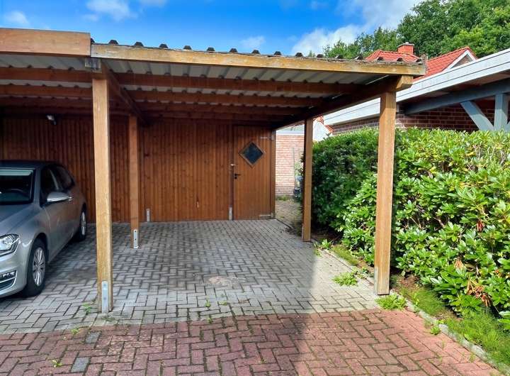 Zu der Wohnung gehört noch ein Carport mit angrenzendem Abstellraum für Fahrräder und Mülltonnen. Auf der geräumigen Auffahrt können noch weitere Fahrzeuge stehen.