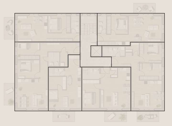 Einladende Balkone im Obergeschoss laden zum Verweilen ein, während die Erdgeschosswohnungen mit landschaftsarchitektonisch gestalteten Gartenanteilen ein besonderes Maß an Privatsphäre bieten.