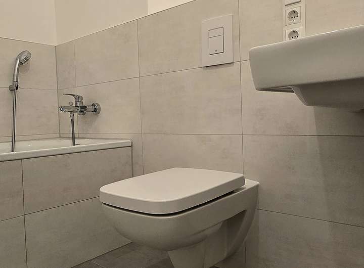 *Gefliestes Bad mit Badewanne und Gäste-WC mit bodengleicher Dusche