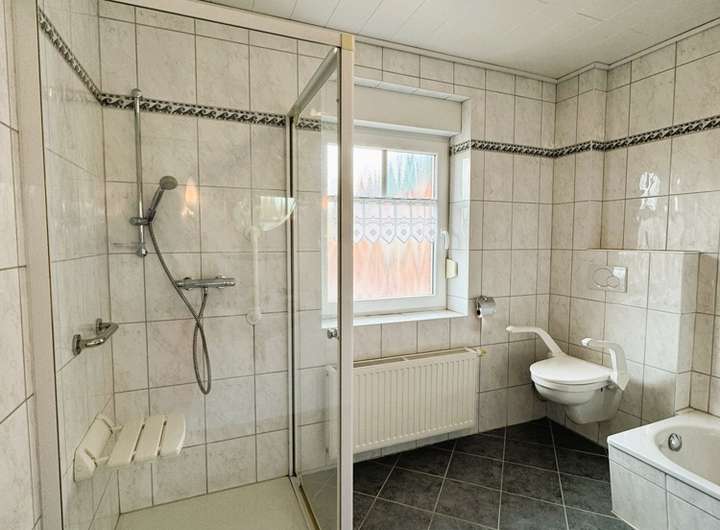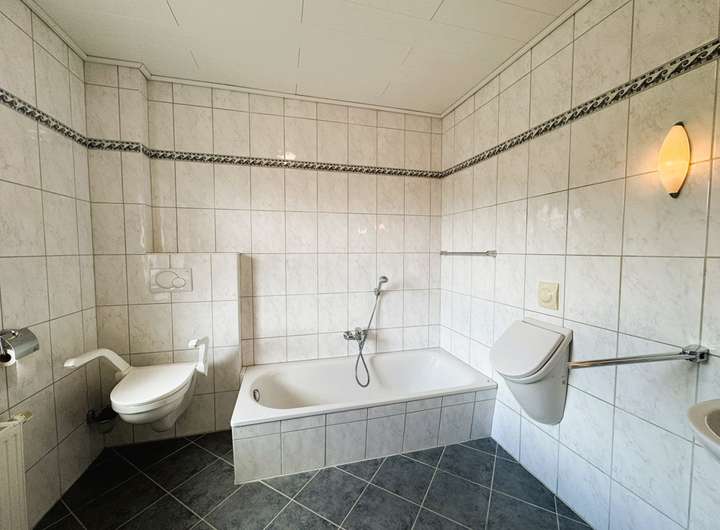 Neben einer Dusche (fast ebenerdig) finden Sie hier auch eine Badewanne, ein Pissoir, ein WC und einen Waschtisch vor.