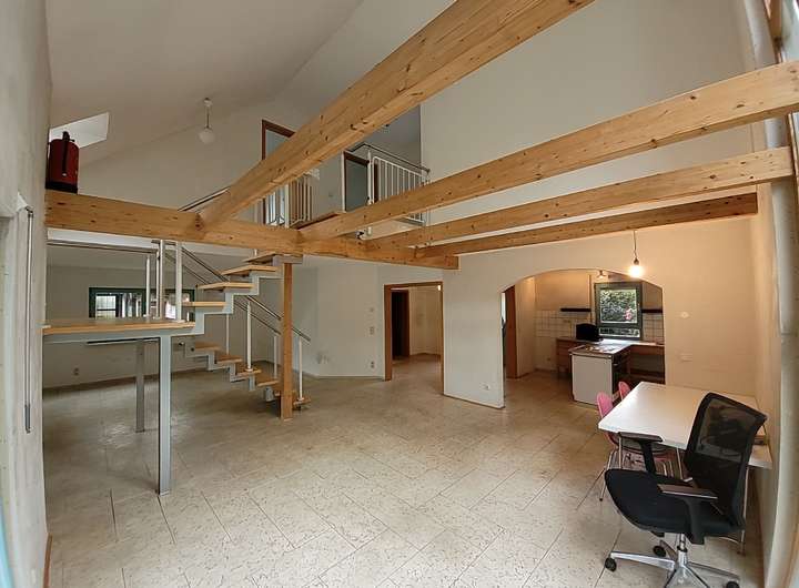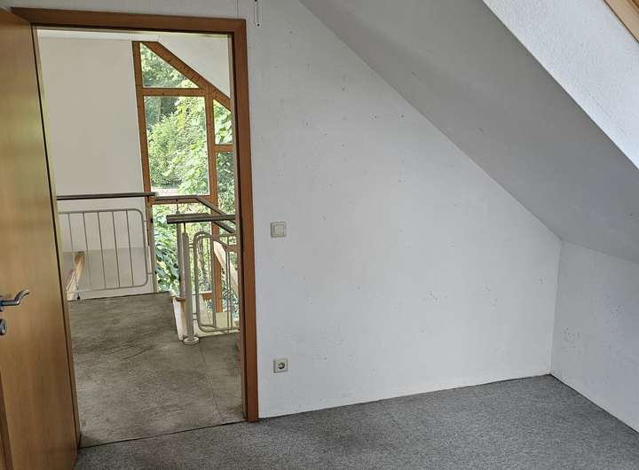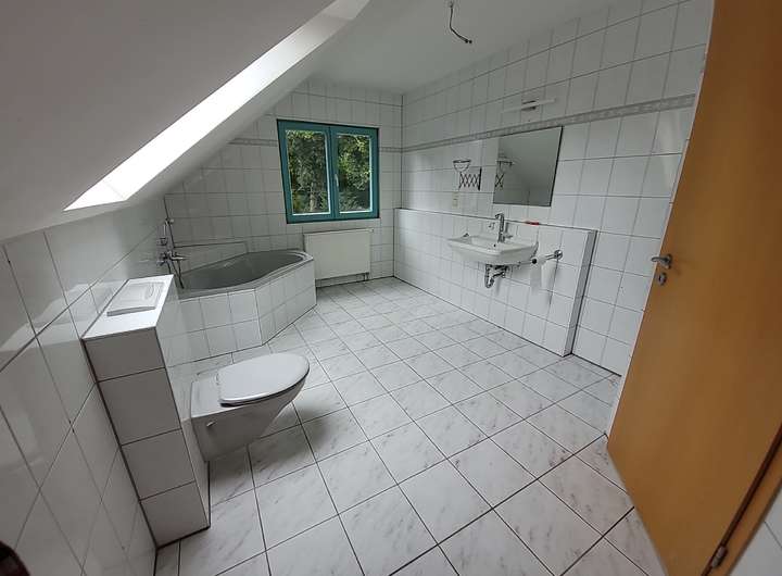 Die offene Holztreppe im Wohnbereich führt ins Dachgeschoss, wo auf der Zwischenebene zum Beispiel Platz für einen Homeoffice-Arbeitsplatz ist. Im Dachgeschoss befindet sich ein großes, gefliestes Badezimmer mit Dusche, Vollbad, WC und Waschbecken, das durch ein Fenster sowie ein Dachfenster sehr hell ist. Weiterhin gibt es zwei gut geschnittene Zimmer, die vielfältig genutzt werden können – als Elternschlafzimmer, Kinderzimmer, Homeoffice oder Hobbyraum. Es besteht die Möglichkeit, die Wohnfläche noch zu erweitern (evtl. genehmigungspflichtig).